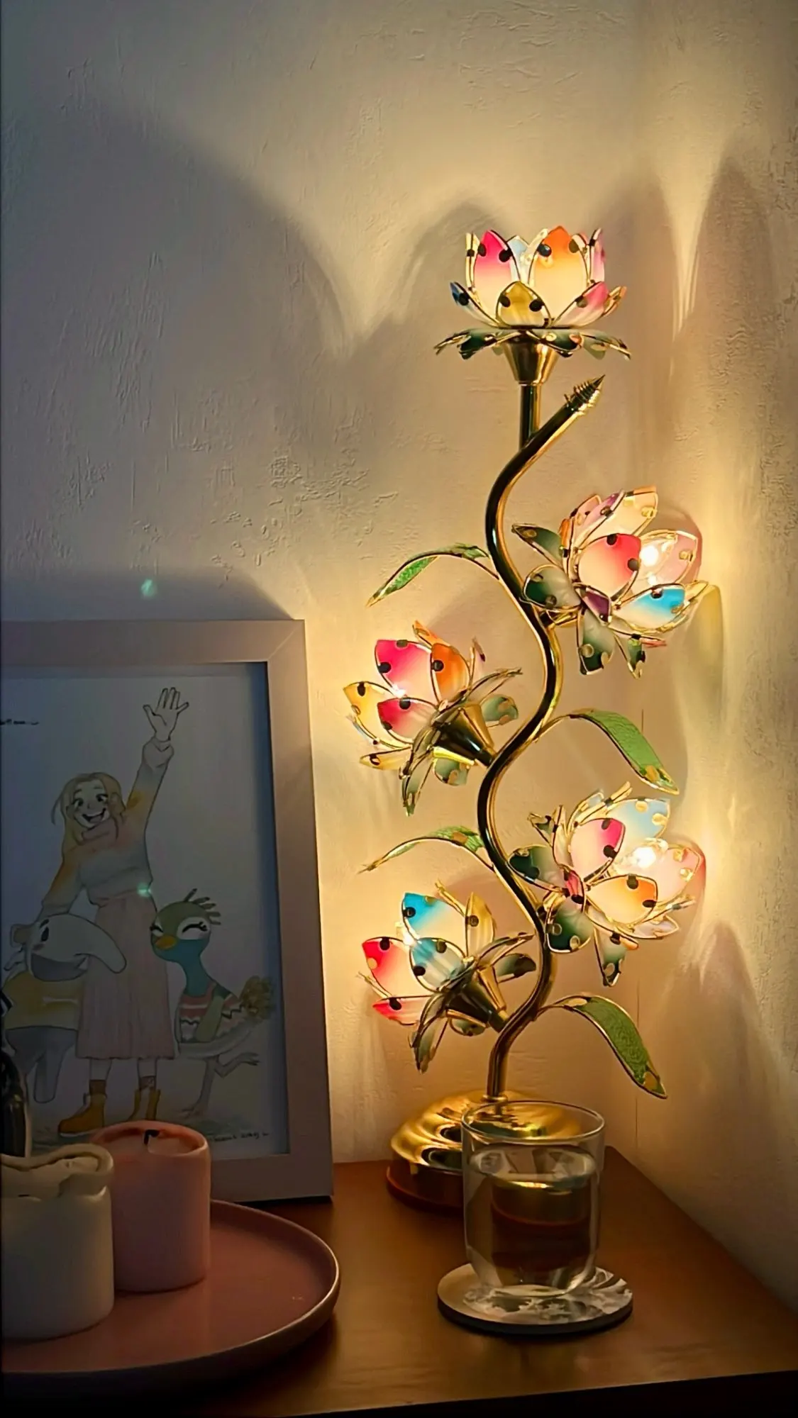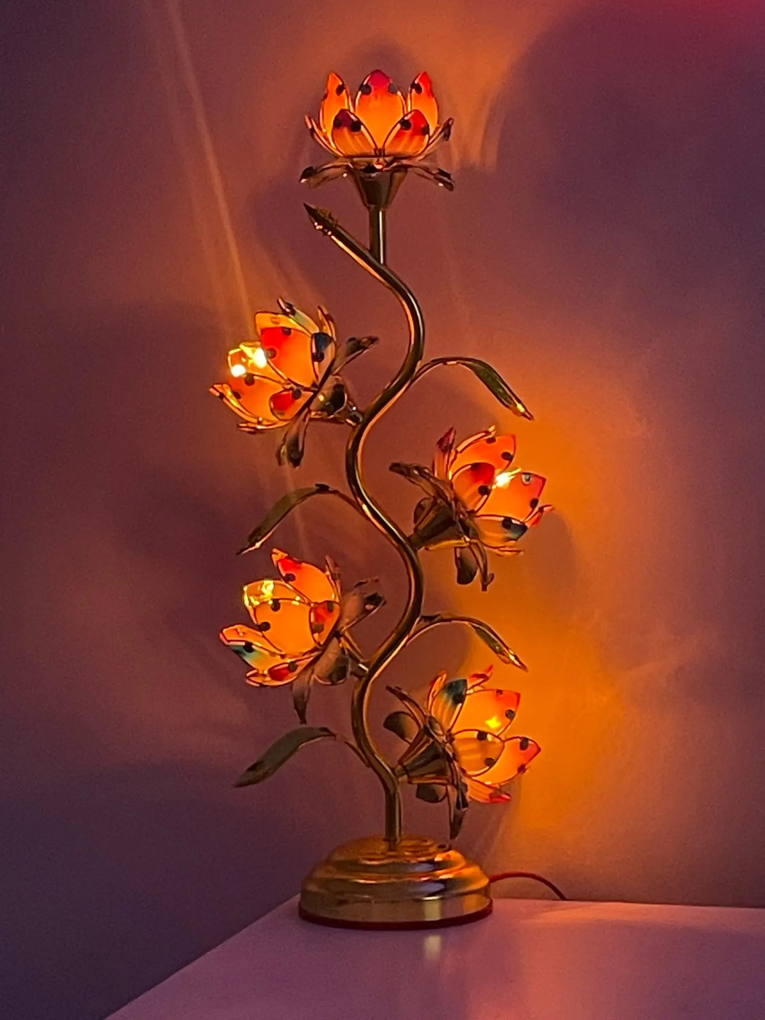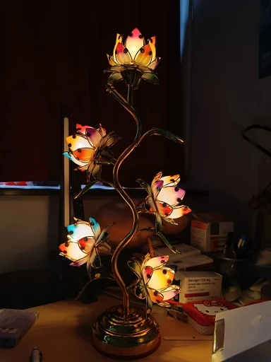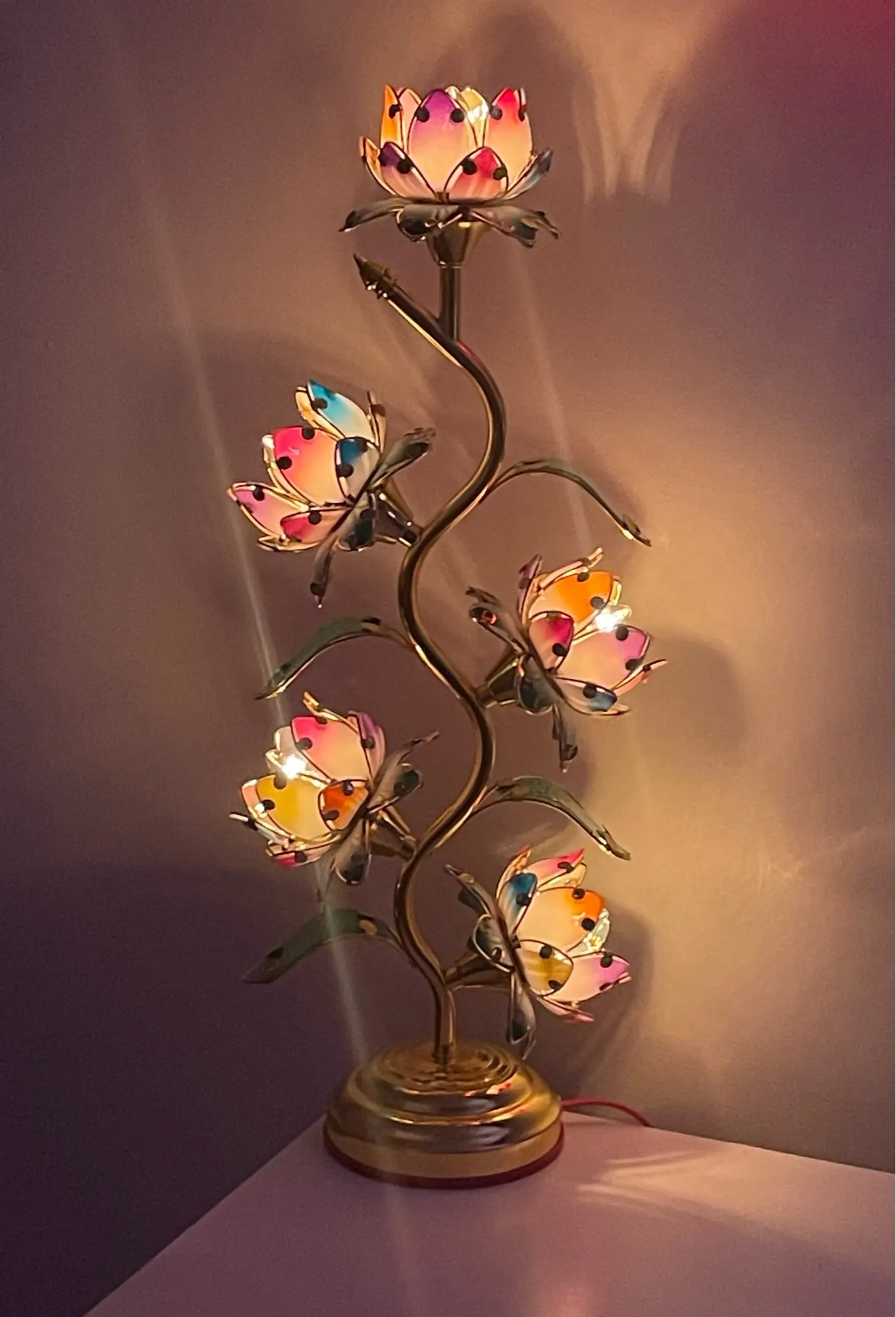 Standing at an impressive 22 inches (55 cm) tall the largest lotus lamp of its kind available five individually glowing lotus blooms cascade along a graceful gold S-shaped stem. Each petal radiates in soft pinks, corals, and greens, lit from within by a warm amber tungsten glow. The kind of light that slows your breathing. The kind that tells your nervous system: you're safe, you can rest now.