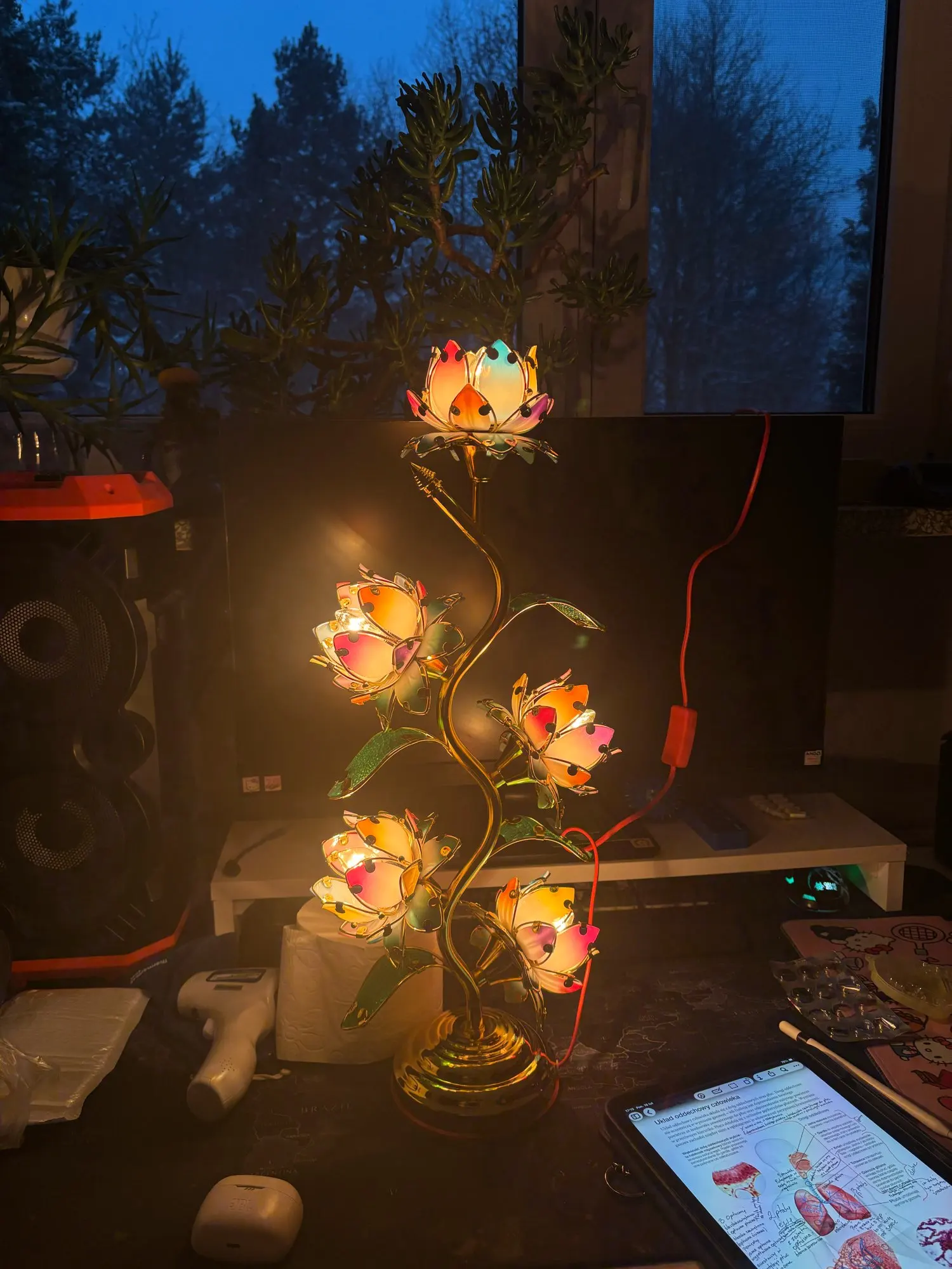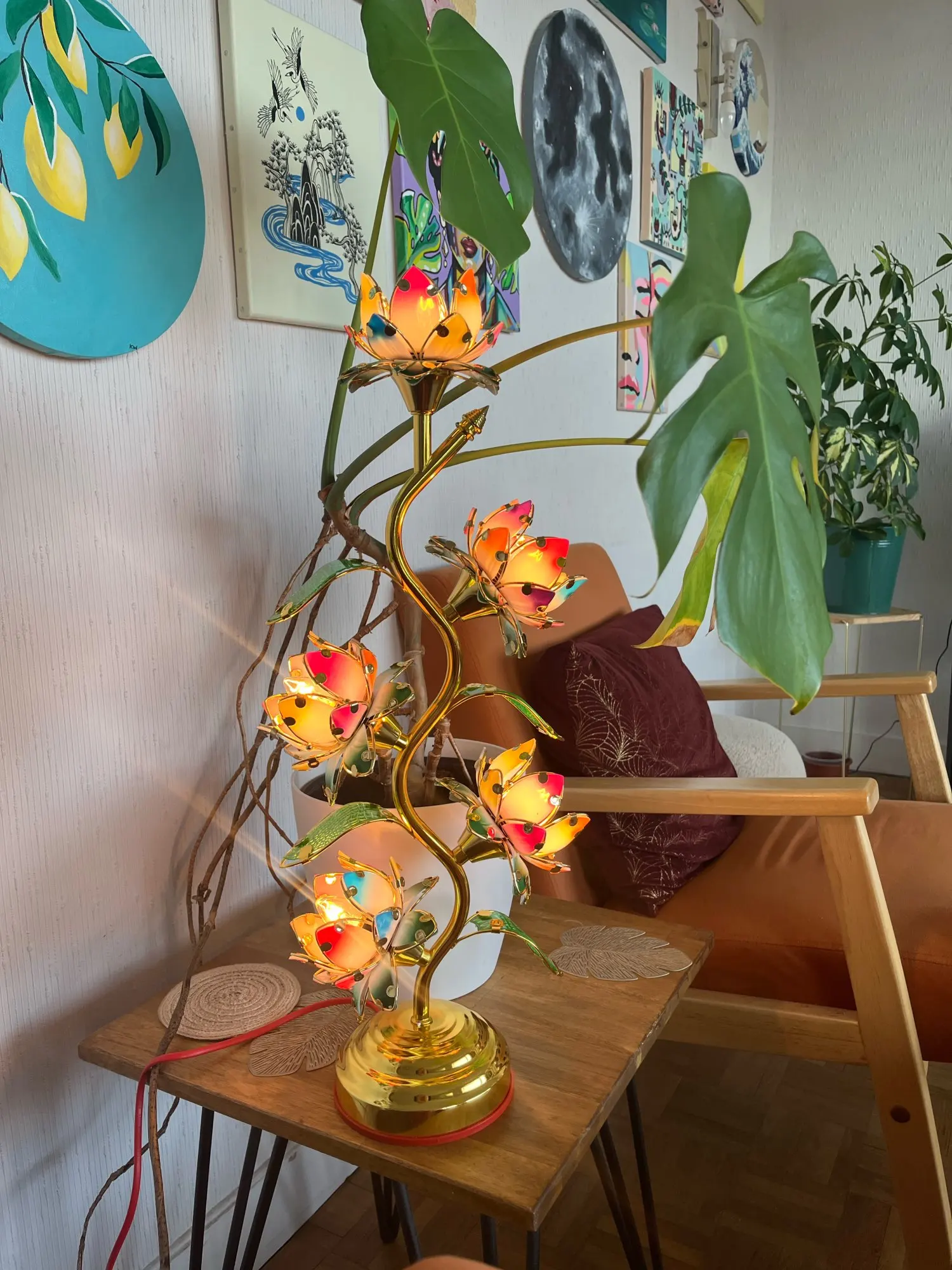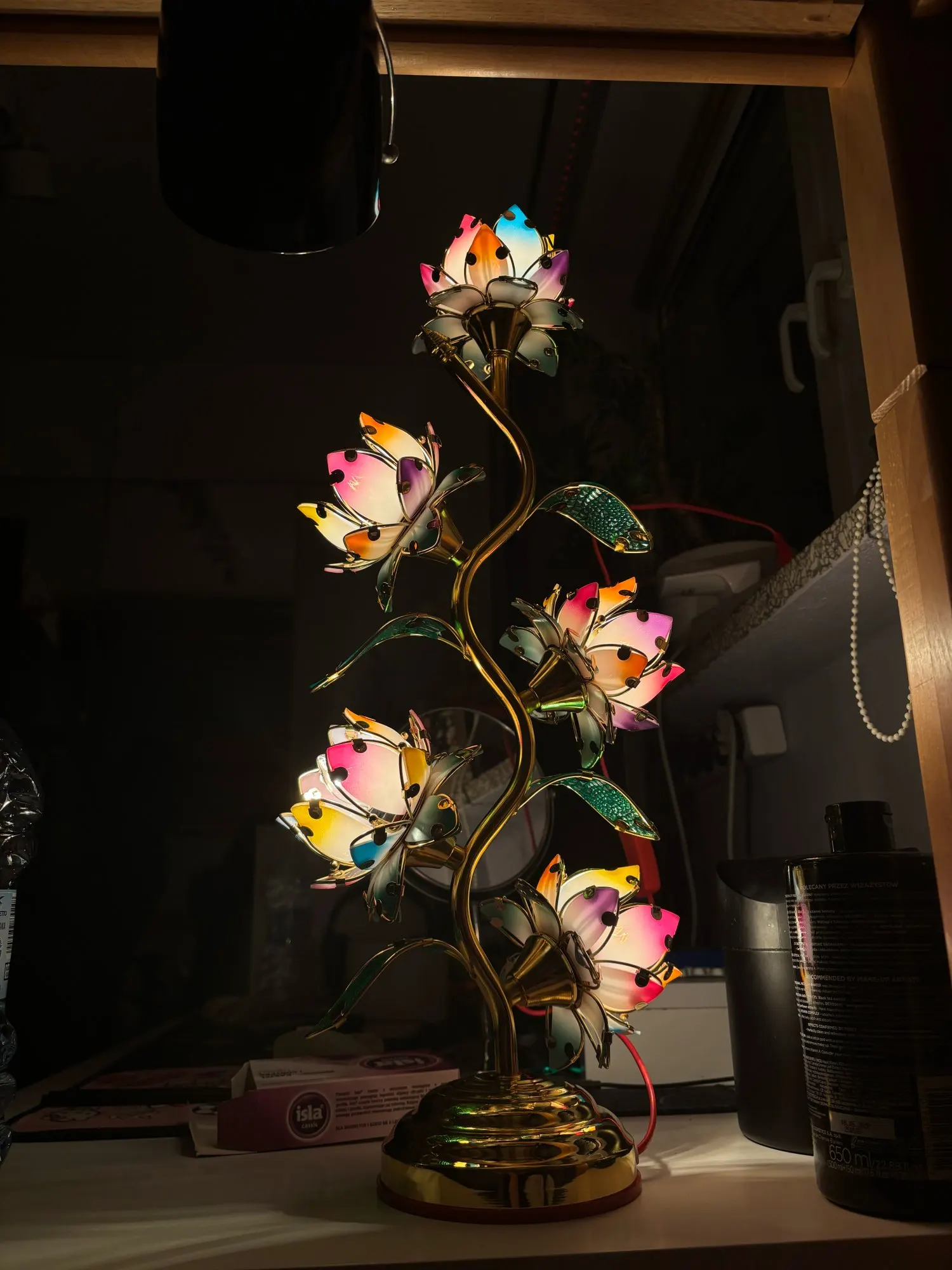 Standing at an impressive 22 inches (55 cm) tall the largest lotus lamp of its kind available five individually glowing lotus blooms cascade along a graceful gold S-shaped stem. Each petal radiates in soft pinks, corals, and greens, lit from within by a warm amber tungsten glow. The kind of light that slows your breathing. The kind that tells your nervous system: you're safe, you can rest now.